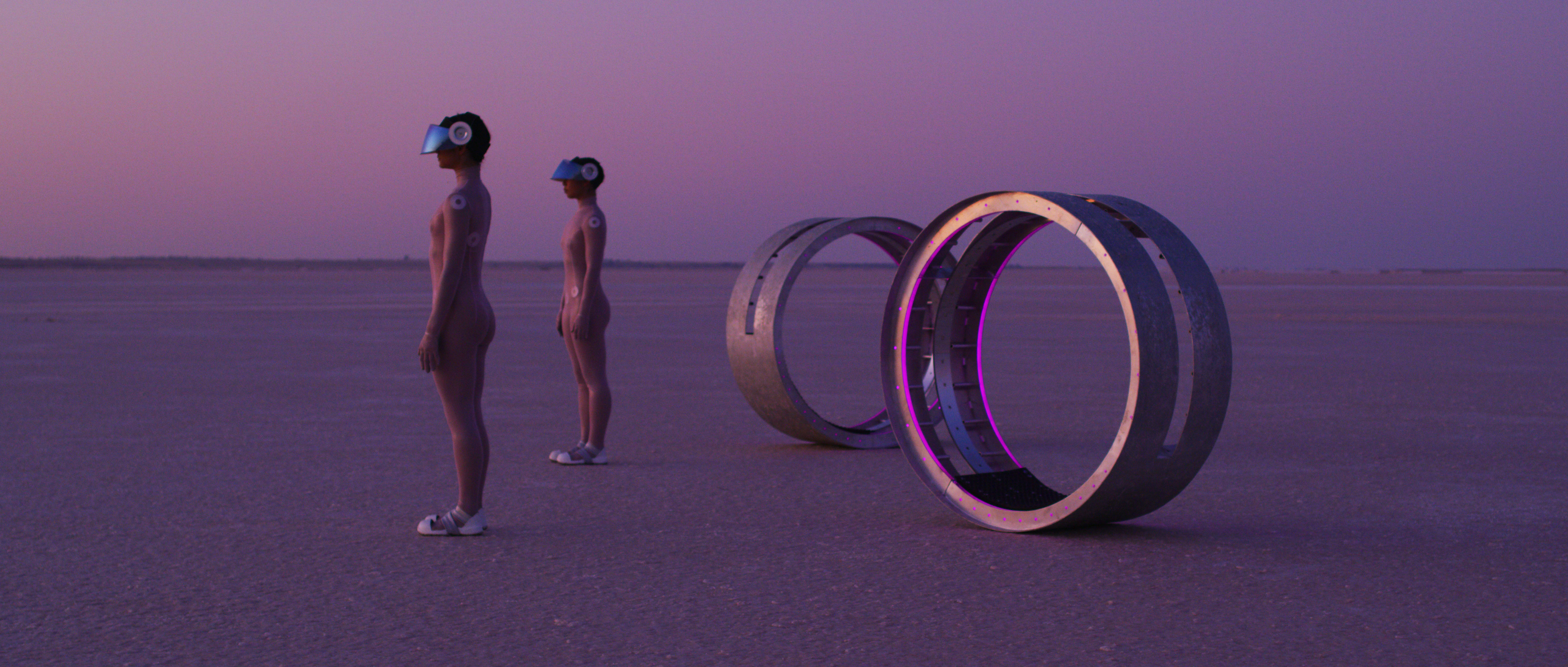 In a new moving-image work by Melbourne-based artist and architect Matthew Bird, two bodies move across the land, working with large cylindrical instruments. We witness them map and survey a terrain analogous to universal physical and psychological locations, each revolution marking a paradoxical attempt to pin an earthly position through perpetual movement. Playing on the human need to understand our relationship to the people and places around us, Parallaxis considers the potential for architectural processes and measurements to act as a foundation for structures of understanding.
